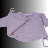 Handgestrickter Wickelpullover für Babys aus 100 % Bio-Merinowolle in zartem Grau. Material GOTS-zertifiziert, temperaturausgleichend & perfekt für empfindliche Babyhaut.