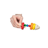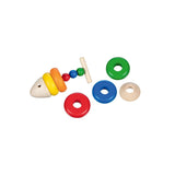 Felix besteht aus Ahorn und ist ein Fisch, ein Fädelfisch. Mit seinen bunten Streifen könnte er auch ein Regenbogenfisch sein. Doch da die Kleinen die Holzringe mit einer Schnur verbinden, dachten wir, es kann nur ein Fädelfisch sein. Dafür schwimmt er nicht weg.