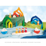 Die liebevoll gestalteten Figuren werden aus Ahornholz gefertigt und sind Made in Europe. Durch ihr neutral gehaltenes Äußeres regen sie die Phantasie an und sind bestens geeignet für freies Spielen- ihren Charakter bekommen sie durch ihre jeweils individuelle Holzstruktur und die leuchtende Lasierung. Wollen die vier Freunde aus Holz mit ihrem Boot ankern, findet sich mit goki evolution eine Welt voller Möglichkeiten für kleine Abenteurer: ein Besuch im Zwergenhaus oder doch vielleicht ans Ende des Regenbogens?